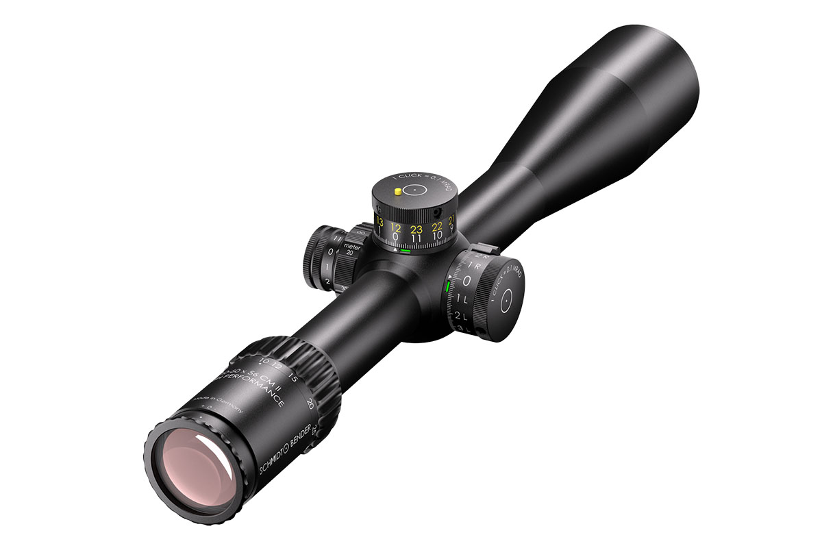 4060537066630 The 10–60×56 CM II High Performance (1.BE) is Schmidt and Bender’s flagship long‑range optic — engineered for extreme‑range competition, professional precision shooting and reconnaissance where uncompromising clarity, magnification and adjustment range are mandatory. Combining a massive 10–60× zoom with a large 56 mm objective, this scope delivers exceptional image resolution and brightness at extreme distances while retaining practical ergonomics for field use. Advanced optical coatings and a refined optical path yield light transmission well above 90%, producing high contrast and excellent target detail even at very high magnifications. The reticle in the first focal plane (FFP) ensures hold‑offs and subtensions remain accurate across the entire magnification range, making the scope ideal for real ranging and ballistic corrections on the fly. Mechanically the CM II High Performance is built around a 34 mm main tube with huge internal adjustment capacity. The elevation envelope exceeds 23 mrad (≈79 MOA) to cover extreme ballistic needs, and ultra‑fine turret options (as low as 0.1 mrad click value) allow precise, repeatable adjustments. The housing is engineered to operate in harsh environments and wide temperature ranges while maintaining mechanical integrity and point‑of‑impact reliability. Key Specifications Magnification: 10–60× Objective Lens Diameter: 56 mm Main Tube Diameter: 34 mm Elevation Adjustment Range: > 23 mrad (approx. 79 MOA) Typical Click Value: 0.1 mrad (configuration‑dependent) Eye Relief: ~90 mm Exit Pupil: approx. 5.6 mm → 1.0 mm across the zoom range Weight: ~940–999 g (configuration dependent) Length: ~442 mm Optical Transmission: > 90 % Reticle: First Focal Plane (FFP) Durability: Weatherproof, fogproof and built for professional field use