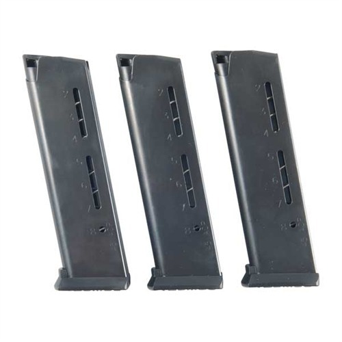 SPECS: 17-7 stainless steel, natural silver or black oxide, finish, with black polymer follower and base pad. Gov’t .45 ACP - 5" (12.7cm) OAL. 8-round capacity.