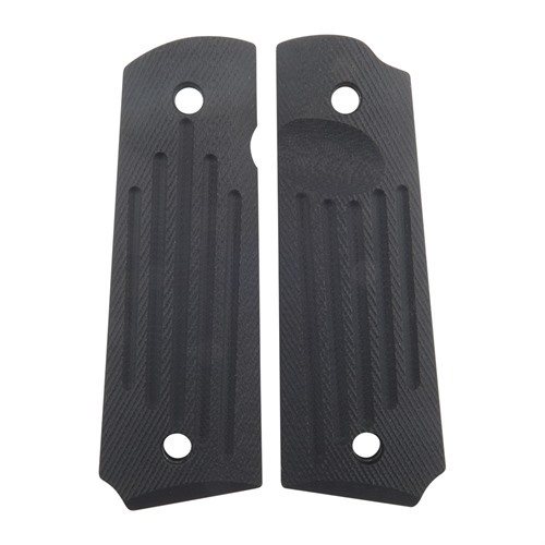 Dessa hållbara G10 glasfiberhandtag är nästan oförstörbara mot lösningsmedel, fukt och utvidgning/kontraktion på grund av temperaturförändringar. Fem djupa, vertikala spår i varje panel och finlinjig diagonal textur hjälper dig att behålla ett fast grepp om pistolen utan att fastna som traditionell checkering.
