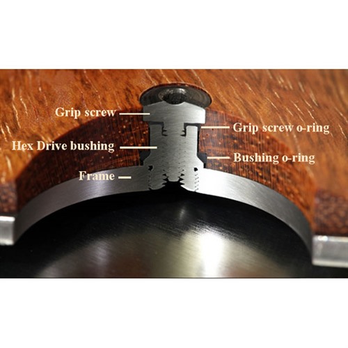 Hex drive bushings kan utrustas med en valfri O-ring som håller greppen på plats och minimerar stötar mot greppen och bushings under avfyrning. Användning av O-ringar minskar risken för repor på ramen från G10 och andra abrasiva greppmaterial, skyddar ömtåliga och dyra grepp som elfenben och mammut-tand, samt minimerar att bushings lossnar på grund av tunga greppmaterial som G10, kolfiber och aluminium.