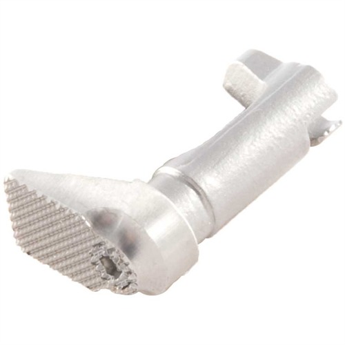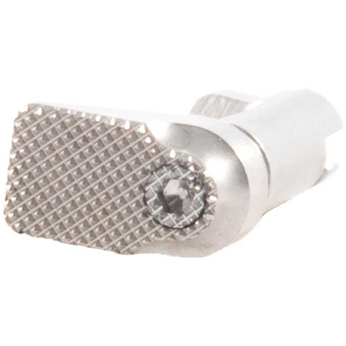 Med en 30 LPI checkering och rektangulär form säkerställs ett fast grepp. Den är tillverkad av stål, med alternativ för blå eller rostfritt stål (SS). Produkten inkluderar en oversize, rektangulär knapp av rostfritt stål, mått 3/8\" (9,2 mm) x ¾\" (19 mm). Observera att magasinfångaren säljs separat utan lås eller fjäder.