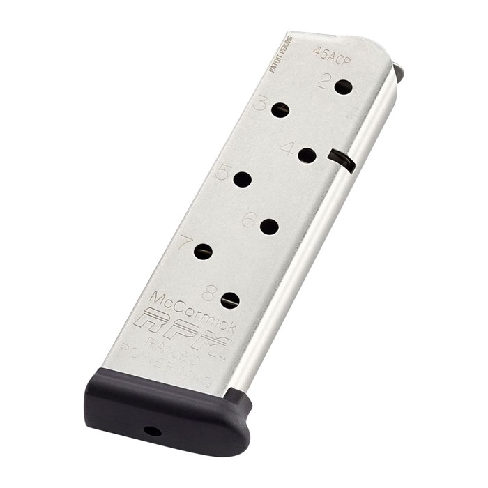 CMC Products Railed Power Mags, or RPM, is a 1911 magazine featuring dual wall feed lips making it the strongest CMC mag ever. No more jams due to thin, warped and bent 1911 feed lips, the RPM mags feature dual wall feed rails at least 2X the strength of standard feed lips. Built with a heavy duty corrosion resistant stainless steel body, the RPM also has an alloy frame safe follower, and numbered witness holes for a visual round count. Fits 1911 Government full size handguns 8 Round capacity 18 Coils of High Tensile Rocket Wire Spring Removable base pad for easy cleaning The RPM design is the result of a relentless pursuit of excellence, maximizing reliability and durability under all conditions.