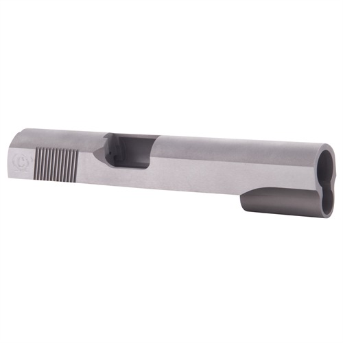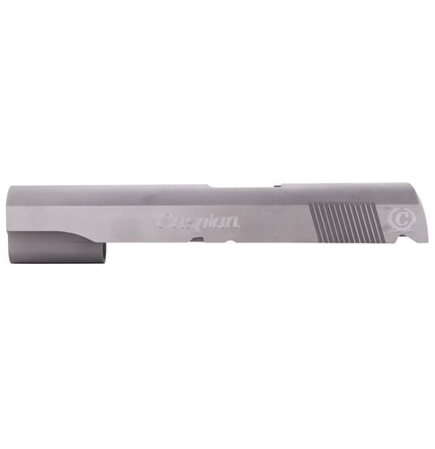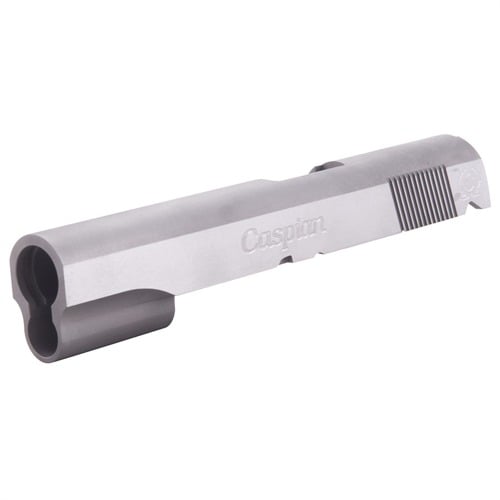 SPECS: 4340 carbon steel, in-the-white, or 416 stainless steel, natural finish. Government model accepts 5" barrel. Commander accepts 4.25" barrel. Officers model accepts 3.5" barrel. All Caspian slides require the use of a 9mm/.38 Super firing pin.
