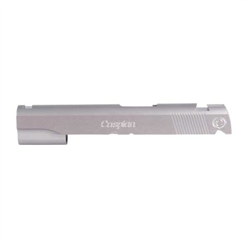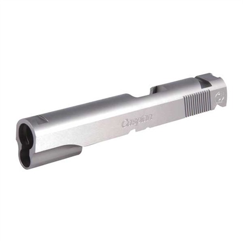 SPECS: 4340 carbon steel, in-the-white, or 416 stainless steel, natural finish. Government model accepts 5" barrel. Commander accepts 4.25" barrel. Officers model accepts 3.5" barrel. All Caspian slides require the use of a 9mm/.38 Super firing pin.