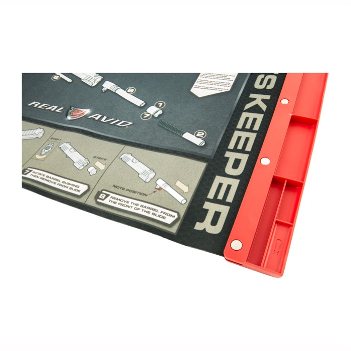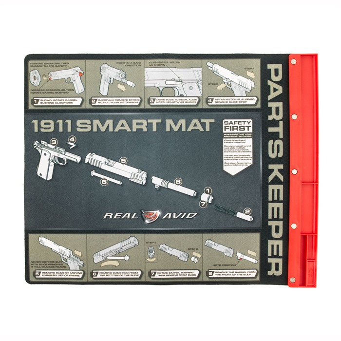 The Real Avid 1911 Smart Mat Cleaning Mat offers 1911 pistol owners with an innovative product that helps to keep their 1911 maintenance easy and organized. The Real Avid 1911 Smart Mat Cleaning Mat includes a number of features not seen on traditional cleaning mats, such as printed disassembly instructions, a magnetic section that captures small metal parts and an attached parts keeper tray that organizes and stores tiny pieces in preparation for reassembly. Measures 19 inches by 16 inches Features oil-resistant surfaces Rolls up easily for storage and transport The Real Avid 1911 Smart Mat Cleaning Mat gives pistol owners the right to keep their 1911 running right and their work surfaces organized and clean.