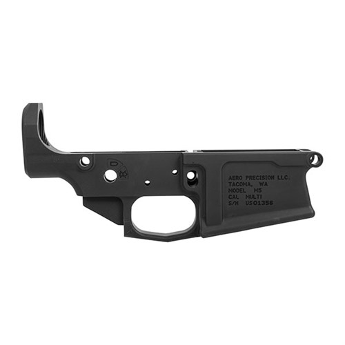 The Aero Precsion M5 308 Lower Receiver allows you to build a custom big-bore AR from the ground up. Mil-spec dimensions and coating ensure the highest quality and correct component interface. Receiver fits DPMS pattern components, including magazines and upper receivers. Machined from 7075-T6 aluminum, and finished with a matte black hard-coat anodized Mil 8625 Type 3 Class 2 finish. Rear takedown pin detent hole threaded 4-40 to allow for a set screw to retain the takedown pin. Bolt catch is threaded for a screw pin, so that no roll pin is needed. Integrated trigger guard and selector markings that function with 45, 60 or 90 degree safety selectors. Accepts Battle Arms Development short throw safety selectors (100-009-866), but also functions with standard safeties.