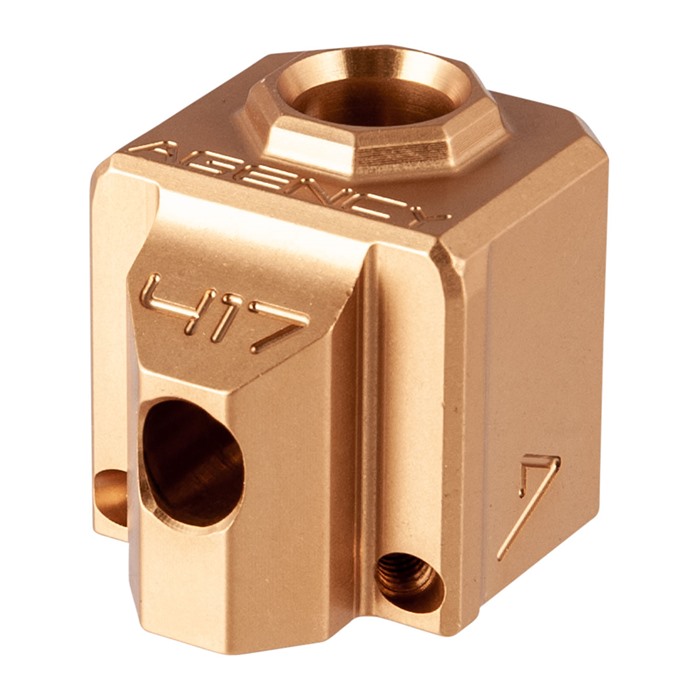 The Agency Arms 417 Compensator is threaded with the standard 1/2x28 thread pitch. It features a single top venting port and it also features a front sight hole. It is designed to utilize the OEM recoil spring assembly and the front sight hole allows you to transfer your existing front sight from your slide to the comp. Compatible with the 17,19 and 34 Includes: Comp 2 Set Screws