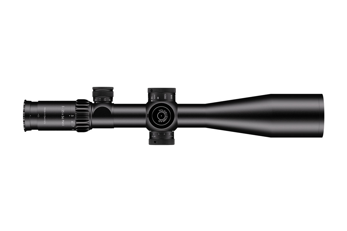 4060537065275 The 5‑25×56 PM II from Schmidt and Bender stands at the pinnacle of variable‑magnification tactical optics, engineered for long‑range precision, outstanding clarity and professional‑level reliability. With a wide 5–25× zoom range and a substantial 56 mm objective lens, it delivers exceptional light‑gathering capability, enabling crisp, bright imagery even at extended distances. Built upon a rugged 34 mm main tube, the scope accommodates large internal adjustment ranges and is designed for demanding use. It features a reticle in the first focal plane (FFP) so that scale and hold‑offs remain accurate at any magnification. The field of view spans approximately 5.3–1.5 m at 100 m, while the exit pupil ranges around 11.0–2.3 mm, and the eye relief remains generous at around 90 mm. The parallax adjustment typically extends from 10 m to infinity, enabling accurate focus from very close ranges through to extreme distances. The turret system is engineered for precision: click values as fine as 0.1 mrad (≈1 cm at 100 m) are available, and a double‑turn elevation turret combined with single‑turn windage allows vast usable correction ranges for wind and elevation. Optical transmission exceeds 90 %, and the construction is nitrogen‑filled, fog‑ and waterproof, ensuring full reliability in all climatic conditions. Key Specifications: Magnification: 5–25× Objective Lens Diameter: 56 mm Main Tube Diameter: 34 mm Field of View: approx. 5.3–1.5 m @100 m Exit Pupil: approx. 11.0–2.3 mm Eye Relief: approx. 90 mm Parallax Adjustment: from ~10 m to infinity Click Value: approx. 0.1 mrad (≈1 cm at 100 m) Optical Transmission: > 90 % Crafted in Germany to the highest standards, the 5‑25×56 PM II is the go‑to choice for military, law‑enforcement and competition shooters who demand absolute clarity, mechanical integrity and extreme flexibility in one optic.