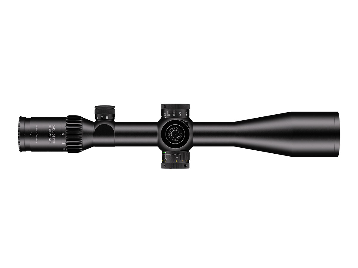 4060537027570 The 5–45×56 PM II High Power is a professional‑grade precision optic that merges a high‑performance riflescope with spotting‑scope capability. Designed for observation and ultra‑long‑range engagement, its enormous 9× zoom range (5–45×) makes it equally at home on reconnaissance, match, or tactical platforms where both identification and shot‑making accuracy are required. Engineered for extreme clarity and reach, the 56 mm objective delivers excellent light gathering while the optical system maintains a large usable field of view across the entire zoom range — allowing fast situational awareness at low magnification and razor‑sharp detail at high power. The reticle sits in the first focal plane, so hold‑offs and subtensions remain precise at any magnification. The model features robust, lockable turrets with fine 0.1 mrad click values and very large usable internal adjustment ranges tailored for extreme‑range correction. Built on a rugged 34 mm main tube, the High Power is constructed for demanding environments: it is fully weatherproof, fogproof and shock‑resistant. Despite its long reach, the design balances mechanical strength with practical ergonomics for field use. Standout Features Exceptional 5–45× magnification range for combined observation and precision shooting Large 56 mm objective for outstanding light transmission and image resolution First focal plane reticle for accurate ranging and holdover at any magnification Precision turrets with 0.1 mrad click value and extensive elevation/windage adjustment range Side/parallax adjustment for crisp focus from mid‑range to extreme distances High optical transmission (~90%) and illuminated reticle options for low‑light operations Robust 34 mm tube, weatherproof and built for professional use Key Specifications Magnification: 5–45× Objective diameter: 56 mm Main tube diameter: 34 mm Field of view: approx. 7.8–0.9 m @ 100 m Exit pupil: approx. 8.8–1.2 mm Eye relief: 90 mm Length: approx. 434 mm Weight: approx. 1,130 g Reticle: FFP (various tactical reticle options) Click value: 0.1 mrad Elevation adjustment range: ~27 mrad (internal ~29.6 mrad) Windage adjustment range: ±6 mrad (internal ~21.1 mrad) Parallax: adjustable Illumination levels: multiple (illuminated reticle available) Optical transmission: ~90% Designed and manufactured to professional standards, the 5–45×56 PM II High Power is the go‑to optic for operators and precision shooters who require unmatched versatility, extreme reach and uncompromising optical and mechanical performance.