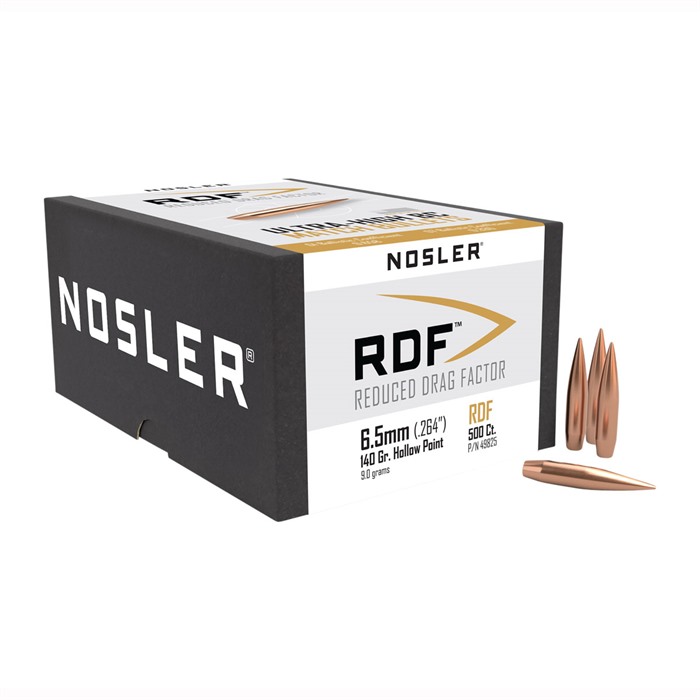 NOSLER REDUCED DRAG FACTOR (RDF) 6.5MM (0.264") HOLLOW POINT BOAT TAIL RIFLE BULLETS Creating the flattest trajectory and least wind drift possible is Nosler’s RDF bullet which was designed from the ground up to provide exceptionally high ballistic coefficients. The key attributes to the RDF’s outstanding performance are Nosler’s meticulously optimized compound ogive and long, drag reducing boat-tail, which make hand loading a snap and create an incredibly sleek form factor. RDF bullets also feature the smallest, most consistent meplats of any hollow point match bullet line, saving you time from having to point or trim tips. FEATURES: Hollow Point Boat Tail. Compound Ogive is insensitive to seating depth. Very small meplat. Ultra-High BC for flatter trajectory and reduced wind drift.