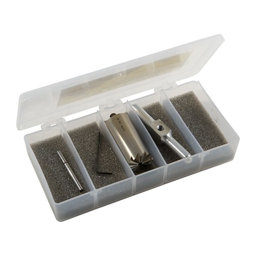 Verktyget är tillverkat av härdat stål och har en 90° facing cutter som säkerställer att din mynning blir perfekt formad. Det inkluderar ett handtag och en pilot, allt förpackat i en praktisk polypropylenlåda. Den utbytbara piloten håller skärverktyget korrekt justerat. Du kan även köpa extra piloter för att använda en och samma cutter för flera olika kalibrar. Piloter för andra kalibrar finns tillgängliga separat.