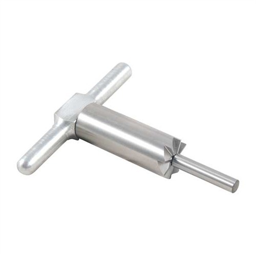Den härdade stålet, 90° facing cutter kvadrerar en muzzle efter förkortning; eller använd den för att laga bucklor och skador. Verktyget levereras med ett handtag och en pilot, allt i en polypropylenlåda. Den utbytbara piloten håller cutter korrekt justerad. Köp extra piloter för att använda en cutter för många olika kalibrar. Piloter för andra kalibrar finns tillgängliga separat.