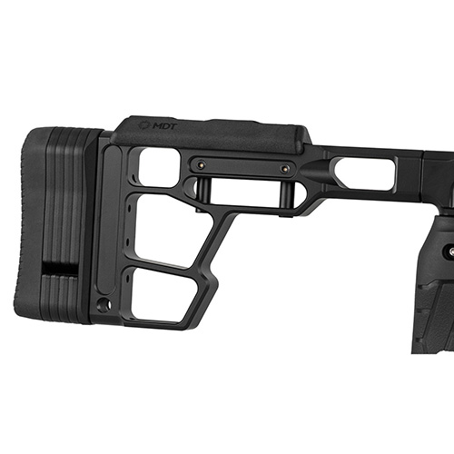 MDT ACC Premier GEN2 Chassis System erbjuder överlägsen precision, stabilitet och styvhet. Den breda, tjocka och platta föränden eliminerar flex och vridning, vilket skapar en mycket stabil plattform på barrikader och andra PRS-prop. Systemet har även en fullängds integrerad ARCA-skena för att montera bipoder och tripoder för ökad stabilitet.