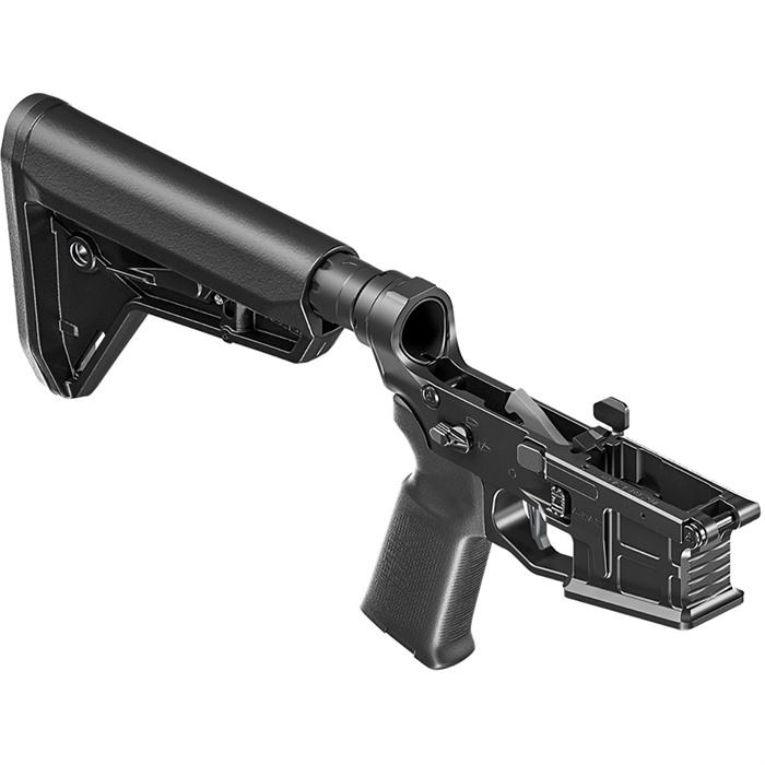 - Billetbearbetad 7075-T6 underdel med integrerat avtryckarskydd och utvidgad magasinbrunn.