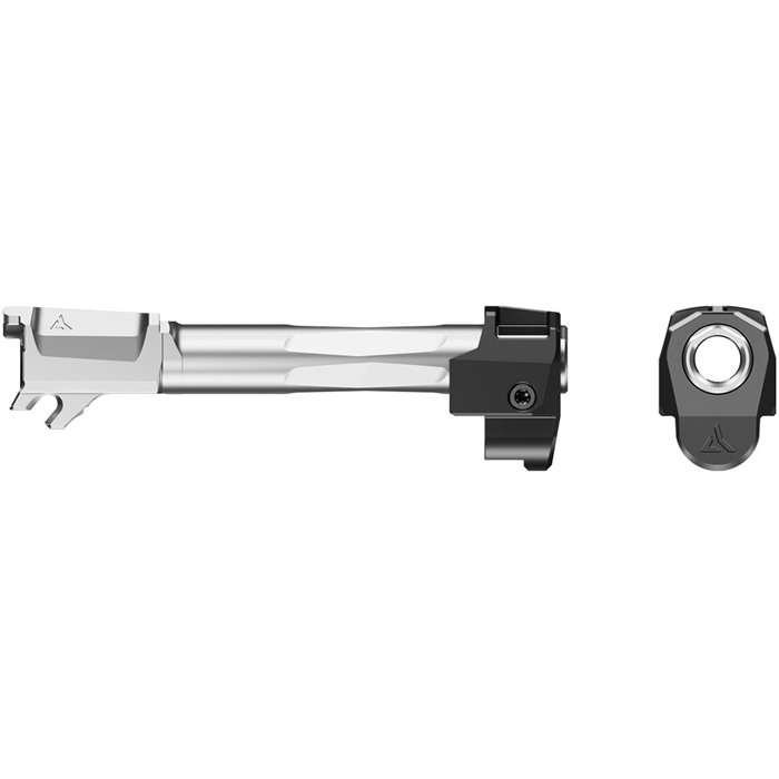 The Radian® AFTERBURNER™ + RAMJET™ combo provide unprecedented recoil reduction and match grade accuracy in a concealed carry package. The threadless barrel design allows for effortless install/removal for cleaning, while LEGAL FOR SALE IN ALL 50 STATES*. The AFTERBURNER™ compensator is machined from hardened stainless steel and the RAMJETTM barrel from hardened 416R SS; both are enhanced with a Radianite Black coating. This combination achieves low friction, high hardness, and high corrosion resistance, making overall durability and erosion from muzzle blast a non-issue. Angled front faces on the AFTERBURNER™ aid in holstering. The INTRA-LOK® mounting system uses the taper lock principle; a tapered locking screw interfaces with an angled V-groove on the underside of the barrel. This perfectly times the compensator as it locks down onto the upper barrel profile on the muzzle end of the barrel. INTRA-LOK® allows the user to simply slide the compensator over the barrel, insert and tighten the locking screw, making for a simple and repeatable installation process. This system allows the user to easily remove the barrel from the slide for cleaning. FEATURES AFTERBURNER™ Hardened SS RAMJET™ Hardened 416R SS atch Grade Barrel Gas Sealing Chamber Loaded Chamber Indicator