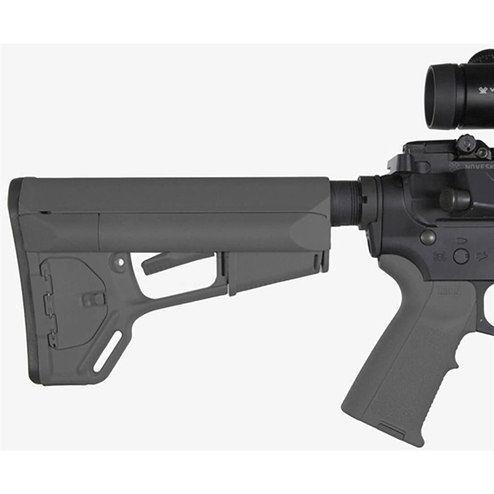Adaptable Carbine/Storage (ACS) stock is a drop-in replacement for standard USGI M4 collapsible stock that gives the tactical operator extra storage options, a secure, comfortable cheekweld, and an advanced dual-locking lever. Smooth, streamlined exterior contours prevent snagging on clothing, sling, or vegetation, and help ensure fast exits from vehicles without snagging on gear. Removable battery storage compartments run the full length of the extra-wide comb and hold 2 AA or 3 CR-123 batteries, while providing a wide, contoured area for an exceptionally solid, comfortable cheekweld. Secure molded rubber caps keep water and dust out of compartments and face the rear of the stock for easy removal; cap exterior is beveled to resist snagging when shouldering weapon. Positive-locking trapdoor on right side of the stock reveals a roomy storage compartment for additional batteries, coiled up cleaning cable and other cleaning supplies, ear plugs, spare parts, or other small items. Magpul’s dual locking system uses an additional cam lever to protect the release lever from accidental operation, yet still allows you to adjust length of pull by simply pushing on the release lever. Slot molded in the toe provides an attachment point for a 1¼" wide sling. Also includes the same detachable rubber buttpad found on Magpul CTR and UBR buttstocks to help keep stock firmly mounted on shoulder. Mil-Spec fits 1.14" O.D. buffer tubes on Colt-manufactured M4 and similar mil-spec tubes that accept both four- and six-position collapsible stocks.