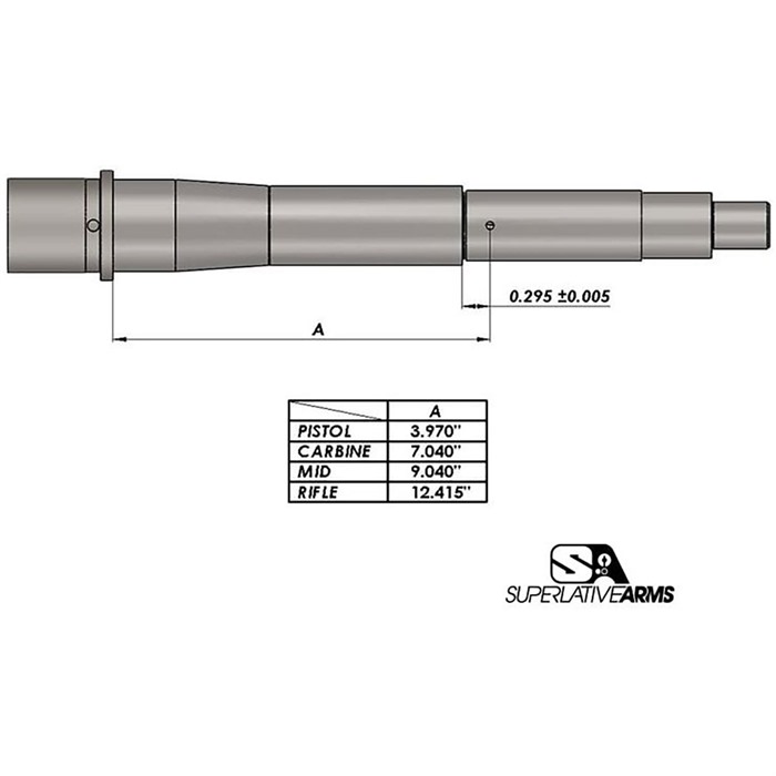 SUPERLATVIE ARMS LLC AR-15 ADJUSTABLE PISTON SYSTEM W/CLAMP 0.625" BLOCK RIGHT HAND The Superlative Arms Patented Bleed Off® Mode, gas piston system for the AR-15 platform adjusts the gas flow by bleeding the gas out the front of the block instead of restricting the flow like conventional adjustable blocks. RESULTS: The pressure used in the block is reduced only to the amount required to drive the bolt carrier. The remaining gas and pressure are bled out of the block allowing the system to run much cleaner and cooler. Reduction of wear on the bolt carrier group components and upper receiver. Reduction of felt recoil allowing for faster follow-up shots. Patented adjustment detent is located outside of the block and therefore no contamination. In Bleed Off Mode the gas adjustment screw does not restrict the gas flow; therefore, there is no erosion or seizing of the screw, and no loss of detent due to carbon build up. Although it is removable, we have added a safety mechanism, which stops you from unintentionally backing the screw all the way out. When using SBR’s and/or suppressors the Bleed Off port allows the excessive pressure to be exhausted out of the block reducing blow back. NOTE: The Superlative Arms Piston Kit does not come with a Bolt Assembly (bolt, cam pin, firing pin, or firing pin retainer). Bolt Assembly sold separately. ***NOTICE: PRIOR TO PURCHASING THIS PRODUCT*** Please review the barrel schematic for the critical dimensions necessary to safely operate the pistol length piston system. There is no industry standard for the distance between the barrel extension to the center of the gas hole. This is critical for the op rod length. If it is not the same distance as stated on the schematic, you may bend the op rod. THIS PRODUCT IS NOT RATED FOR 300 BLK!!! SPECIFICATIONS: Piston Systems: Piston Kits Gas Block Size: .625 Gas Block Style: Clamp On Gas System Length: Pistol Carrier Type: Full-Auto, AR-15 Carrier Finish: Dark DLC