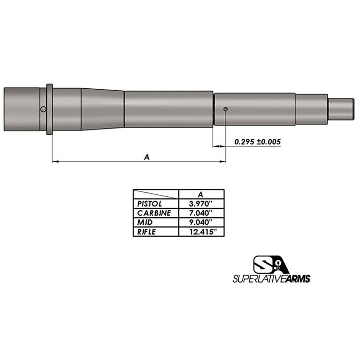 SUPERLATIVE ARMS LLC AR-15 ADJUSTABLE PISTON SYSTEM W/CLAMP ON .750" BLOCK RIGHT HAND The Superlative Arms Patented Bleed Off® Mode, gas piston system for the AR-15 platform adjusts the gas flow by bleeding the gas out the front of the block instead of restricting the flow like conventional adjustable blocks. RESULTS: The pressure used in the block is reduced only to the amount required to drive the bolt carrier. The remaining gas and pressure are bled out of the block allowing the system to run much cleaner and cooler. Reduction of wear on the bolt carrier group components and upper receiver. Reduction of felt recoil allowing for faster follow-up shots. Patented adjustment detent is located outside of the block and therefore no contamination. In Bleed Off Mode the gas adjustment screw does not restrict the gas flow; therefore, there is no erosion or seizing of the screw, and no loss of detent due to carbon build up. Although it is removable, we have added a safety mechanism, which stops you from unintentionally backing the screw all the way out. When using SBR’s and/or suppressors the Bleed Off port allows the excessive pressure to be exhausted out of the block reducing blow back. NOTE: The Superlative Arms Piston Kit does not come with a Bolt Assembly (bolt, cam pin, firing pin, or firing pin retainer). Bolt Assembly sold separately. ***NOTICE: PRIOR TO PURCHASING THIS PRODUCT*** Please review the barrel schematic for the critical dimensions necessary to safely operate the pistol length piston system. There is no industry standard for the distance between the barrel extension to the center of the gas hole. This is critical for the op rod length. If it is not the same distance as stated on the schematic, you may bend the op rod. THIS PRODUCT IS NOT RATED FOR 300 BLK!!! SPECIFICATIONS: Piston Systems: Piston Kits Gas Block Size: .750 Gas Block Style: Clamp On Gas System Length: Pistol Carrier Type: Full-Auto, AR-15 Carrier Finish: Dark DLC