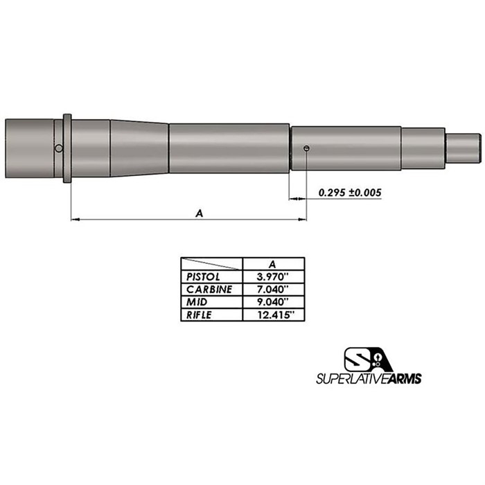 SUPERLATIVE ARMS LLC AR-15 ADJUSTABLE PISTON SYSTEM W/CLAMP ON .750" BLOCK RIGHT HAND The Superlative Arms Patented Bleed Off® Mode, gas piston system for the AR-15 platform adjusts the gas flow by bleeding the gas out the front of the block instead of restricting the flow like conventional adjustable blocks. RESULTS: The pressure used in the block is reduced only to the amount required to drive the bolt carrier. The remaining gas and pressure are bled out of the block allowing the system to run much cleaner and cooler. Reduction of wear on the bolt carrier group components and upper receiver. Reduction of felt recoil allowing for faster follow-up shots. Patented adjustment detent is located outside of the block and therefore no contamination. In Bleed Off Mode the gas adjustment screw does not restrict the gas flow; therefore, there is no erosion or seizing of the screw, and no loss of detent due to carbon build up. Although it is removable, we have added a safety mechanism, which stops you from unintentionally backing the screw all the way out. When using SBR’s and/or suppressors the Bleed Off port allows the excessive pressure to be exhausted out of the block reducing blow back. NOTE: The Superlative Arms Piston Kit does not come with a Bolt Assembly (bolt, cam pin, firing pin, or firing pin retainer). Bolt Assembly sold separately. ***NOTICE: PRIOR TO PURCHASING THIS PRODUCT*** Please review the barrel schematic for the critical dimensions necessary to safely operate the pistol length piston system. There is no industry standard for the distance between the barrel extension to the center of the gas hole. This is critical for the op rod length. If it is not the same distance as stated on the schematic, you may bend the op rod. THIS PRODUCT IS NOT RATED FOR 300 BLK!!! SPECIFICATIONS: Piston Systems: Piston Kits Gas Block Size: .750 Gas Block Style: Clamp On Gas System Length: Pistol Carrier Type: Full-Auto, AR-15 Carrier Finish: Dark DLC