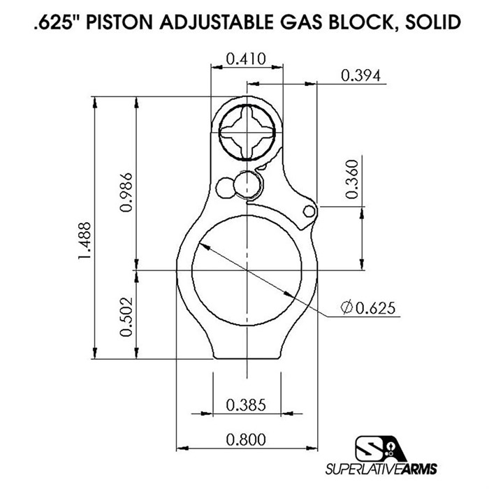 AR-15 ADJUSTABLE PISTON SYSTEM W/0.625" GAS BLOCK LEFT HAND The Superlative Arms Patented Bleed Off® Mode, gas piston system for the AR-15 platform adjusts the gas flow by bleeding the gas out the front of the block instead of restricting the flow like conventional adjustable blocks. RESULTS: The pressure used in the block is reduced only to the amount required to drive the bolt carrier. The remaining gas and pressure are bled out of the block allowing the system to run much cleaner and cooler. Reduction of wear on the bolt carrier group components and upper receiver. Reduction of felt recoil allowing for faster follow-up shots. Patented adjustment detent is located outside of the block and therefore no contamination. In Bleed Off Mode the gas adjustment screw does not restrict the gas flow; therefore, there is no erosion or seizing of the screw, and no loss of detent due to carbon build up. Although it is removable, we have added a safety mechanism, which stops you from unintentionally backing the screw all the way out. When using SBR’s and/or suppressors the Bleed Off port allows the excessive pressure to be exhausted out of the block reducing blow back. NOTE: The Superlative Arms Piston Kit does not come with a Bolt Assembly (bolt, cam pin, firing pin, or firing pin retainer). Bolt Assembly sold separately. SPECIFICATIONS: Piston Systems: Piston Kits Gas Block Size: .625 Gas Block Style: Solid, Set Screw Gas System Length: Carbine Carrier Type: Full-Auto, AR-15 Carrier Finish: Dark DLC