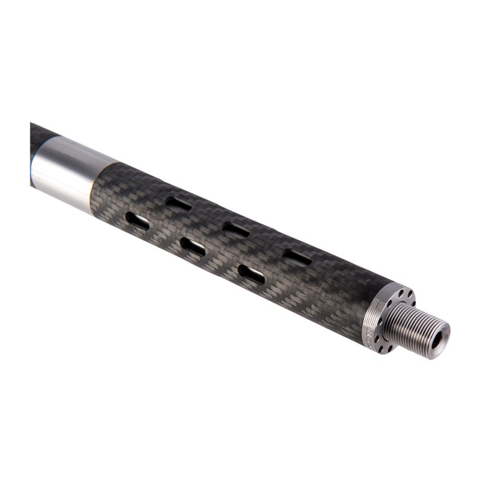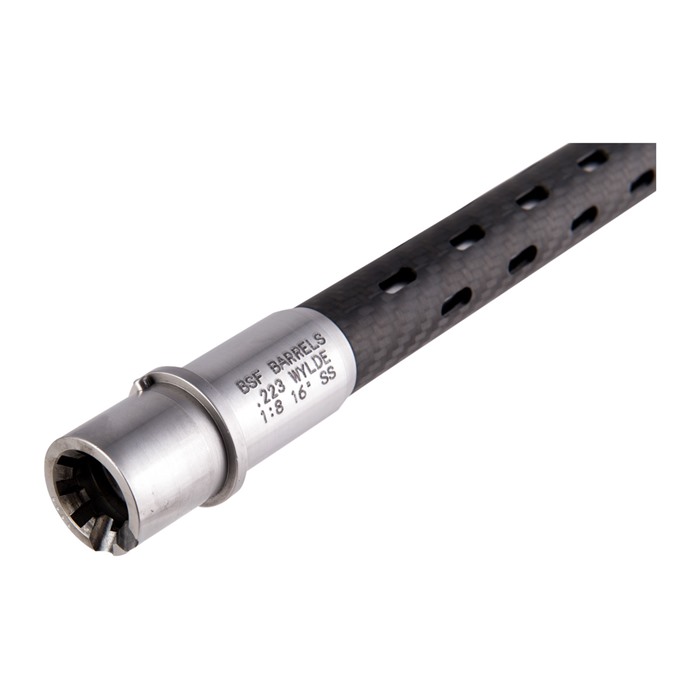 The BSF .223 Wylde Carbon Fiber AR-15 Barrels are built around a 416R stainless steel inner core wrapped in an advanced carbon fiber jacket for enhanced strength and rapid cooling. The result is the rigidity and stability of a heavy target barrel without the enormous weight penalty - your rifle is just as accurate but much easier to lug around! Since the carbon jacket on BSF .223 Wylde Carbon Fiber AR-15 Barrels contact only 5% of the inner barrel, there is an air pocket between the two that allows air to flow freely and keep the inner barrel cool. Vent holes in the carbon fiber jacket let the heat out, promoting a convection cooling process that results in a barrel that can be handled with bare hands, even after dumping two full-size 30-round mags right after each other. .223 Wylde chamber is optimized to give excellent performance with both civilian .223 Rem and military 5.56 NATO ammo 1"-8 rifling stabilizes a wide range of bullet weights .875" O.D. bull/target barrel contour Match-grade 416R stainless steel barrel is double stress relieved to further resist heat warping Three times stronger than steel, the carbon fiber wrap on BSF .223 Wylde Carbon Fiber AR-15 Barrels maintains outstanding rigidity and strength while keeping the barrel remarkably light.