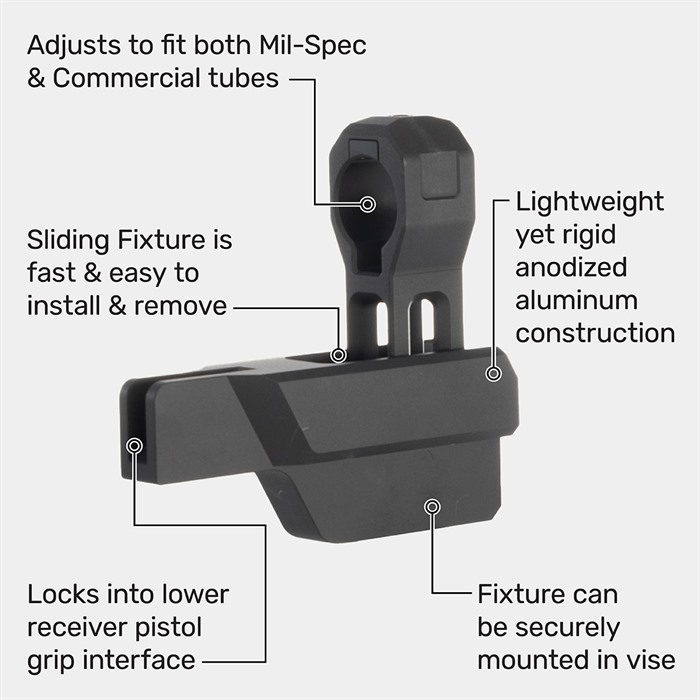 AR-15 LOWER RECEIVER BUFFER TUBE VISE FIXTURE Keep your buffer tube straight while tightening your castle nut. Here at Brownells, we know how hard it is when tightening the lower receiver castle nut to keep the buffer tube from rotating during building or maintenance of an AR-15 platform. That is why we have developed the AR-15 Lower Receiver Extension Vise Fixture. Made from anodized aluminum, place the fixture in your favorite vice, like the Brownells Bench Vise, and tighten it down. Insert the lower onto the fixture with the buffer tube through the sliding tube support. Move the sliding tube support toward the receiver leaving enough room for an armorer’s wrench. Adjust the support for mil-spec and commercial tubes simply by using an adjustment screw on top of the sliding tube support. Once adjusted and tightened, ensure your buffer is aligned and set your castle nut with confidence to the proper torque specifications. Specifications Holds Mil-Spec and Commercial AR-15/M4 Buffer Tubes Hard coated anodized aluminum Overall dimensions 7.09” L x 5.41” H