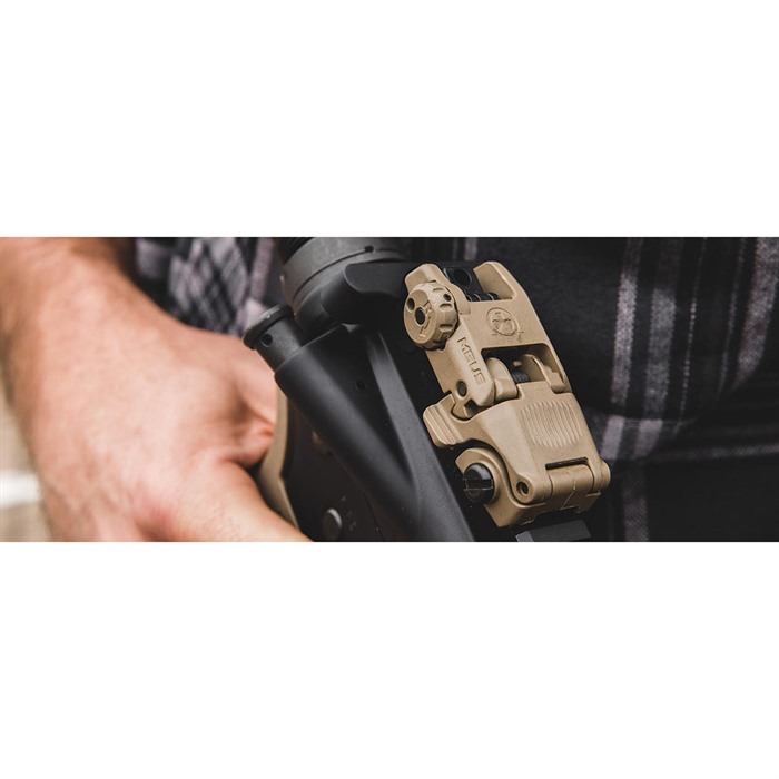 Med strömlinjeformade konturer minimeras risken för att siktet fastnar i buskar, remmar eller annan utrustning när det är ihopfällt. Den fjädrade ambidextrösa frigöringsmekanismen gör det enkelt att aktivera siktet från båda sidor genom att trycka på den räfflade fliken. När du är klar, tryck på samma flikar för att fälla tillbaka siktet.