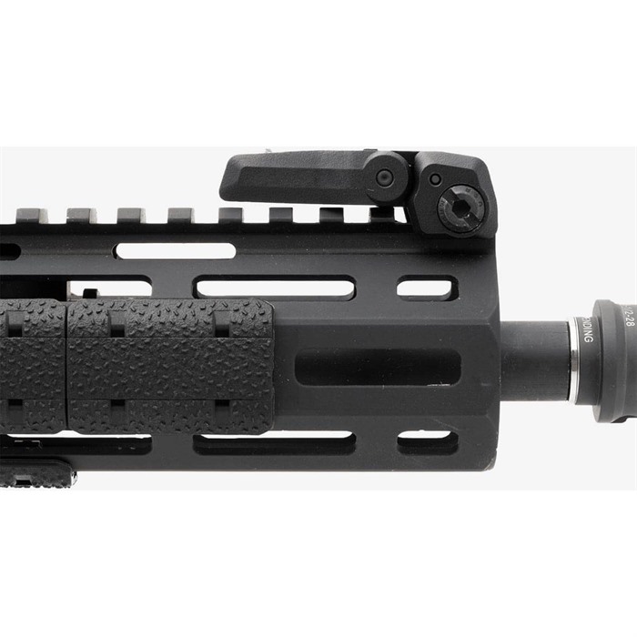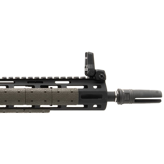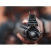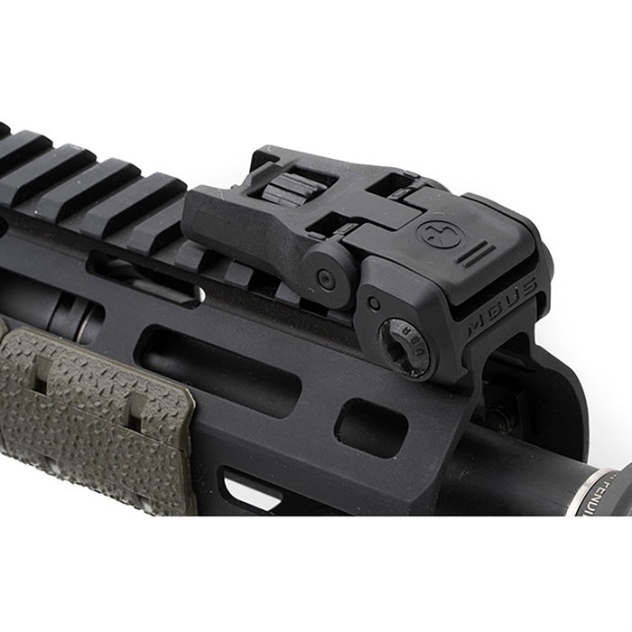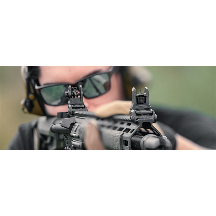En fjäderbelastad tryckknapp fäller ut Magpul MBUS 3 front sikte när det behövs, vilket lyfter det till standard AR-15 sikthöjd. Du behöver inga verktyg för att justera höjden på detta sikte, och det finns till och med ett front sikte med dubbel bredd inkluderat, som liknar det som finns på MBUS Pro.