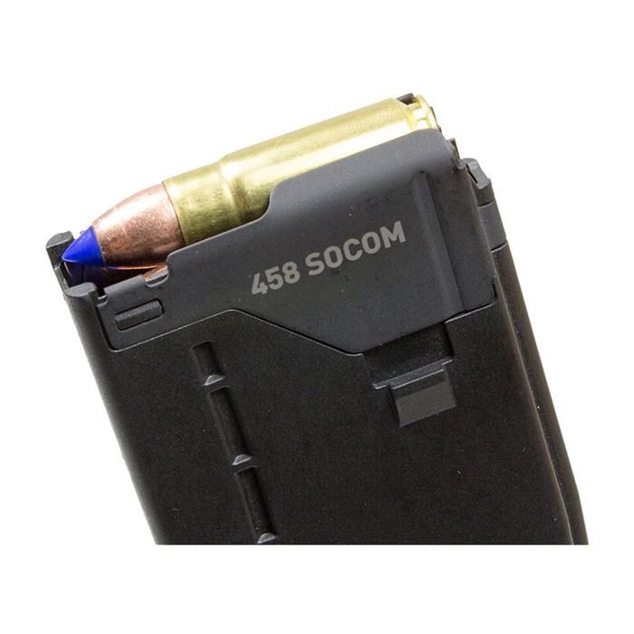 The .458 SOCOM is a big-bore cartridge designed to function in standard AR-15 upper receivers complete with a standard bolt and magazine. However, in reality, users have found that components designed for use with 5.56 NATO rounds aren't set up for perfect performance with this large-bore cartridge, and so CMMG addressed the issue with its MkW-15 Magazine purpose-built for the .458 SOCOM. Each CMMG MkW-15 Magazine is based on the Lancer L5 Advanced Warfighter Magazine, which was the top choice for shooters of the .458 SOCOM. However, there was room for improvement, so CMMG engineers took the existing magazine design and modified the feed lips to better hold .458 SOCOM rounds without weakening the integrity of the design. Since, at its core, the CMMG-modified Lancer L5 magazine is still a 5.56 NATO mag, users can fit 30 rounds of 5.56 NATO into it, which will function fine. However, the magazine will also provide premium performance when loaded with 10 .458 SOCOM rounds. Due to the many state restrictions on magazine capacity we will not ship these magazines to individuals in the following restricted states: Hawaii, Maryland, Massachusetts, New Jersey, New York, California, Connecticut, Colorado, Washington D.C., Chicago/Aurora/Oak Park Illinois, South Bend Indiana.