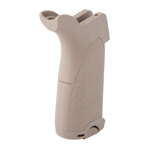 Det ergonomiskt förbättrade greppet har en reducerad vinkel och är tillverkat av hållbar, stöt- och slagtålig polymer. Det har en texturerad yta för ett fast grepp och en vattenresistent, gångjärnsförsedd dörr som öppnas för att avslöja ett litet fack som rymmer batterier eller andra små föremål.