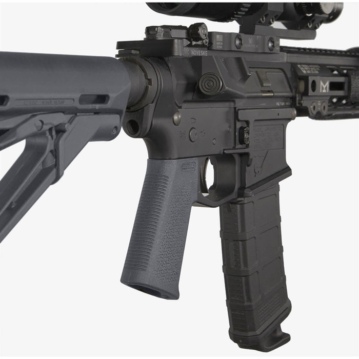Material: Förstärkt formgjuten polymer, svart, flat mörk jord, O.D. grön, mörk jord eller grå. Passar standard mil-spec AR-15/M16 underreceiver. Passar också de flesta AR-stil .308 gevär som accepterar AR-15/M16 grepp. Monteringsutrustning ingår.
