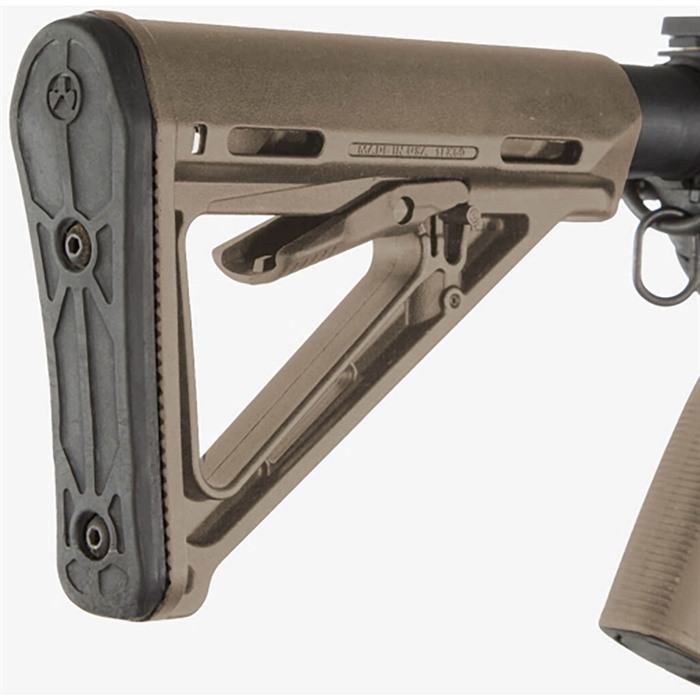 Den slagtåliga och värmebeständiga polymerkonstruktionen inkluderar inbyggda förstärkningar vid stresspunkter, samt två fästen för webbslingor och ett hål för en tåmonterad svinghake eller klämma. Den mjuka, syntetiska gummibakplattan ökar komforten och hjälper till att förhindra glidning. Mil-Spec passar 1,14" O.D. buffertuber på Colt-tillverkade M4 och liknande mil-spec tuber som accepterar både fyra- och sexpositioners hopfällbara kolvar.
