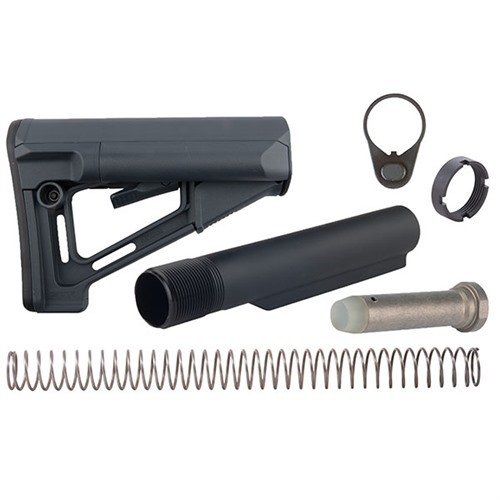 An enhanced version of the Magpul CTR® stock, the STR (“Storage/Type Restricted”) buttstock features two 4¼" left- and right-side positioned battery storage tubes and a wider cheekweld for extra comfort. Rubber caps at the rear keep the storage compartments resistant to water incursion, yet pop off easily for access to two AA or two CR-123 batteries inside. Features two integral 1¼" sling loops and a socket for a pushbutton QD sling swivel on each side of the stock. Friction locking mechanism minimizes wobble between the buffer tube and the buttstock for a solid, secure "feel", which is enhanced by the detachable .30" thick rubber rubber that adds plenty of "grab" to prevent shoulder slippage. The STR Buttstock Kit includes the following items: Mil-Spec buffer tube Carbine buffer Chrome Silicone recoil spring Receiver end plate Receiver extension castle nut