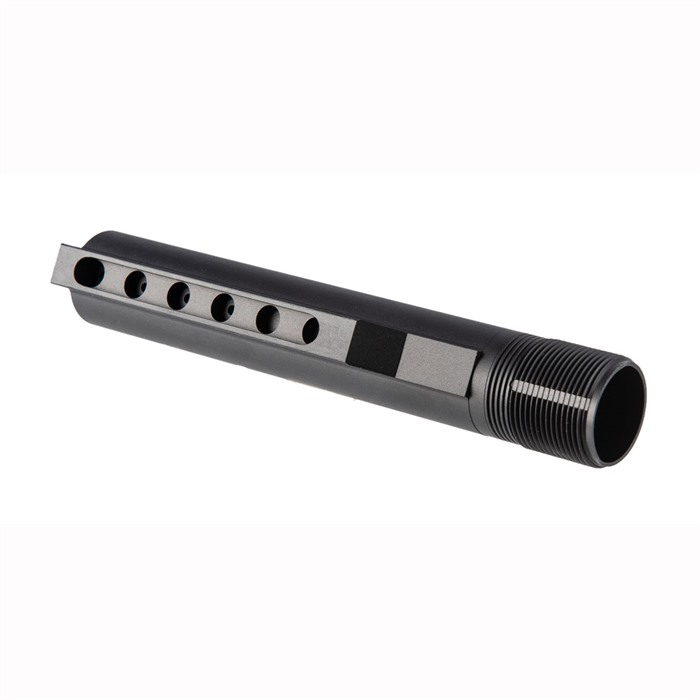 Brownells AR-15 Mil-spec receiver 6 position extension tube has the correct 1.148" outside diameter to ensure proper fit of adjustable mil-spec carbine stock. Allows you to install a mil-spec stock on a commercial carbine, convert a rifle with a fixed A2 style stock to an adjustable M4 stock, or complete a custom build. Six machined notches on the underside prevent the stock locking pin from slipping, yet still offer outstanding ease and flexibility in setting the buttstock length. Precision machined from strong, lightweight 7075 aluminum, then hardcoat anodized with a hard, wear-resistant matte black finish.