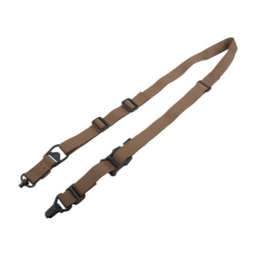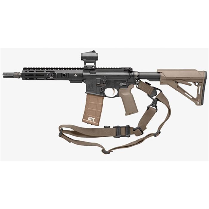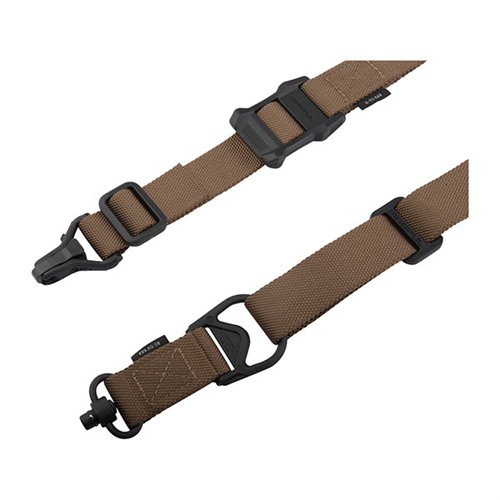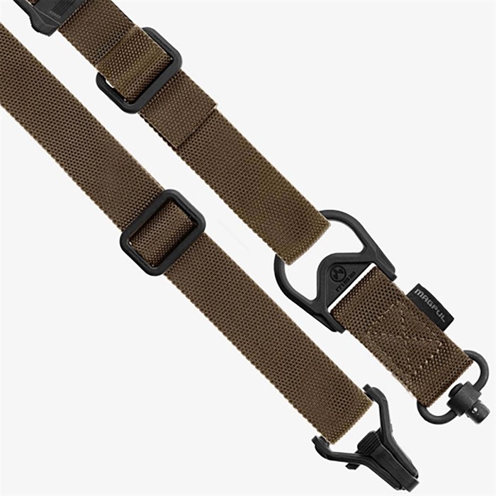 Filling the same mission requirement as the standard MS3 Sling, the MS3 Single QD can quickly switch between one-point and two-point configuration. The MS3 Single QD maintains material construction and specifications identical to that of the standard MS3, but features a heavy-duty push-button QD Sling Swivel for the one-point (rear) weapon attachment rather than the Magpul Paraclip™. This modification allows compatibility with QD sling cups commonly found on lower receivers, receiver end plates, and buttstocks. The MS3 Single QD GEN2 incorporates a new low profile quick-adjust Slider which minimizes bulk and allows for secure, yet effortless, sling adjustment. Webbing length has also been increased for a comfortable fit with all body types and armor configurations. Made in USA and 100% Berry Amendment compliant. NSN: MAG515-COY 1005-01-657-7616 FEATURES THE MS1® SLIDER Rapidly adjustable for length (shorter or longer) with new MS1 Slider Low-profile adjustment Slider for adding or removing sling tension in two-point mode with a single-hand MULTIPLE CONFIGURATIONS Designed for easy rapid convertability between one-point and two-point mode Heavy-duty push-button Quick Disconnect sling swivel for one-point attachment Paraclip shackle allows for fast transition between one-point and two-point configuration Cross-Bolt Lock Bar in the Paraclip allows the user to optionally lock its lever closed for extra security MAGPUL POLYMER AND INDESTRUCTIBLE HARDWARE Lightweight heavy-duty reinforced polymer hardware Steel Paraclip lever is case hardened and finished with a QPQ salt bath nitride process for extreme resistance to wear and corrosion SNAG-FREE, HIGH DURABILITY WEBBING Custom 1.25 inch wide nylon webbing material is strong and wear resistant while remaining anti-chaff for user comfort No tails, loops, or other potential snag hazards Colored webbing has Near Infrared (NIR) treatment to reduce IR signature SPECS Length, Overall Nominal: 48-60 in. ± 5 in. adjustment Slider Adjustment Range: 10 in. Width, Webbing: 1.25" SLING MOUNTING REAR - Works with the Magpul ASAP® for optimal shoulder transitioning in one-point mode as well as with other end plates, receivers, and buttstocks that have a QD sling socket FRONT - Compatible with the Magpul RSA®, M-LOK® Paraclip™ Sling Mount, MSA®, and shotgun Forward Sling Mounts, as well as many snap-hook style sling loops* and standard or QD sling swivels for use in two-point mode * Snap-hook style sling loops with an inner diameter of at least 3/8" are required, but 9/16" and larger will provide full range of motion of the Paraclip