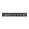 Den maskinbearbetade aluminiumfria handguarden använder en unik barrel nut och ett roterande låssystem för att säkerställa korrekt justering av toppskenan med mottagarskenan. Handguarden glider över pipan och gasröret i en vinklad position tills den notched barrel nut indexerar i den interna spårkanalen för en säker passform. Två hexskruvar låser handguarden på plats, och en inbyggd stoppmekanism förhindrar överdriven åtdragning.