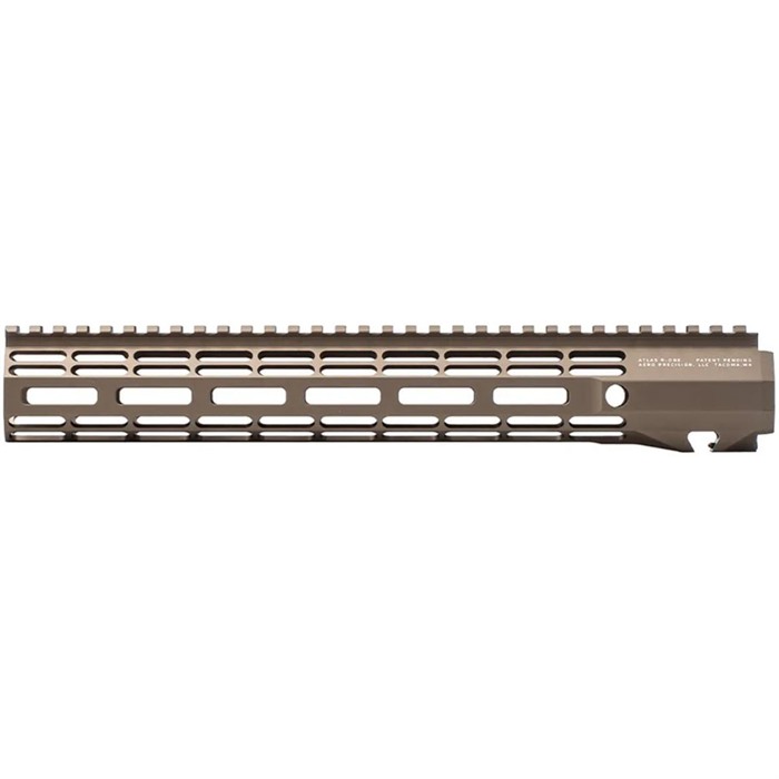 The ATLAS R-ONE is the newest addition to the Aero Precision Handguard lineup. Machined from 6061-T6 Aluminum, the R-ONE line of handguards are designed with size and weight in mind, providing the perfect handguard for your lightweight build. Our proprietary ATLAS attachment system is a durable and dependable mounting platform, maintaining a slim profile while still providing the strength and stability customers have grown to love from Aero Precision handguards. Available in KeyMod and M-LOK® profiles with 12" and 15" options (7" and 9" options coming soon). ATLAS The new Aero Taper Lock Attachment System (ATLAS) is both functional and aesthetically pleasing. It features 2 mirrored tapered locking nuts that provide evenly distributed clamping pressure across a custom engineered barrel nut with use of a turnbuckle screw. A ratcheting detent further secures the design while providing positive registration during installation. By design, the even pressure of the ATLAS system avoids distortion of the handguard often seen with current applications during installation. All hardware mounting parts are included with the purchase of an ATLAS Handguard. Lightweight By Design KeyMod Handguard Weights: 7" - 5.12 oz / 9" - 5.92 oz / 12" - 7.84 oz / 15" - 8.96 oz M-LOK Handguard Weights: 7" - 5.22 oz / 9" - 6.03 oz / 12" - 8 oz / 15" - 9.07 oz Mounting Hardware Weight: 4.72 oz (same across all ATLAS Handguard options) Features: Full top picatinny rail for optional attachments Quick disconnect sling socket at the 3, 6 and 9 o'clock positions Compatible with low profile gas blocks 1.3" Inside diameter 1.5" Outside diameter Compatible with mil-spec AR15 upper receivers and barrels ATLAS Handguards are designed to match seamlessly with our M4E1 Threaded Upper Receivers. Additionally, they are compatible with any Mil-Spec AR-15 upper receivers as well. However, they may not be compatible with billet upper receivers due to indexing tabs. Save when you buy them as a combo.