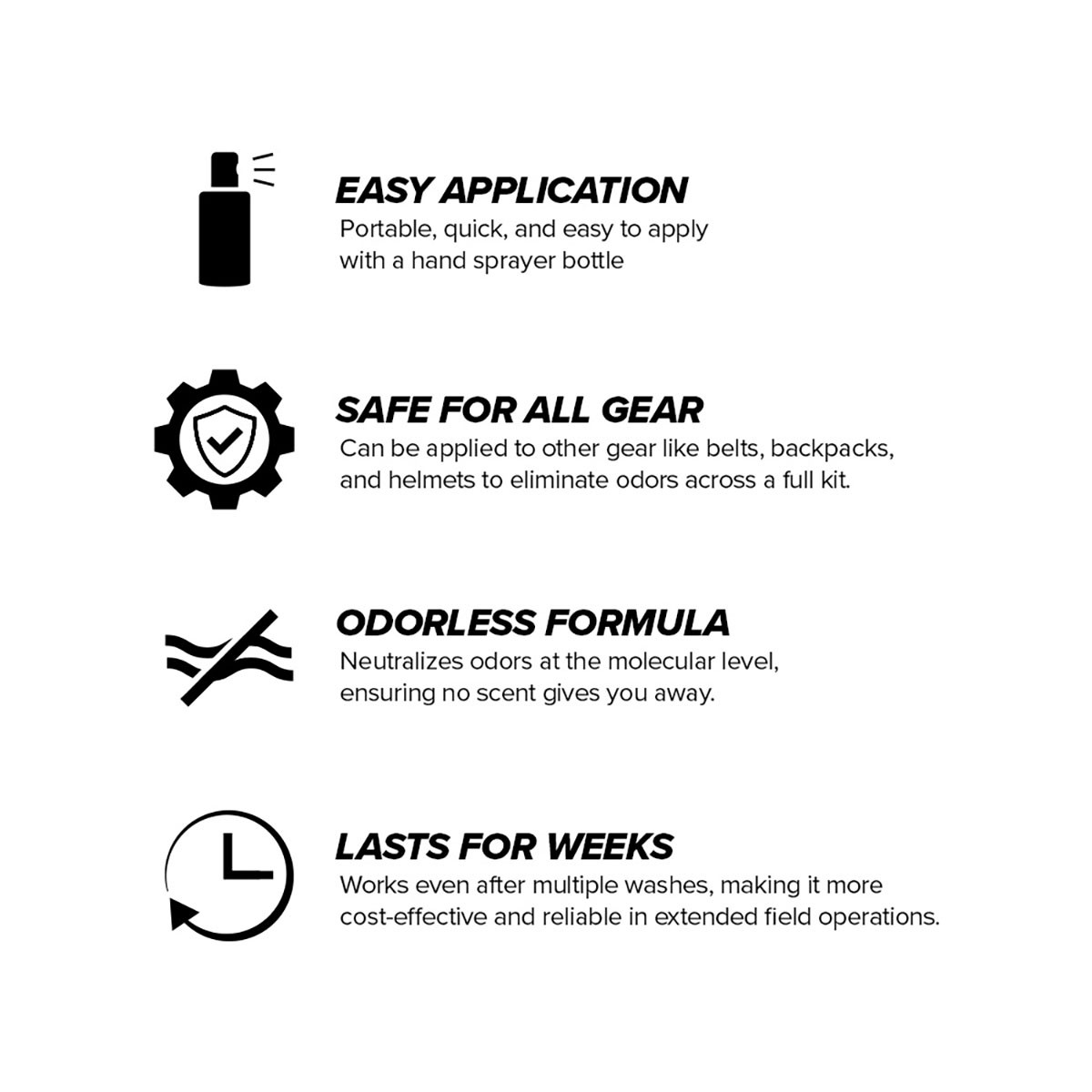 0792649433270 Kan inte lukta vad som inte finns där I vildmarken förlitar sig djur på sin luktsinne för att upptäcka fara långt innan de ser den. Scent Purge neutraliserar mänsklig lukt genom att binda sig till dina kläder och utrustning, vilket gör att du förblir osynlig för ditt byte. Oavsett om du navigerar genom tuff terräng eller väntar tålmodigt i en post, fungerar Scent Purge genom svett, rörelse och väderförändringar. Med bara en applicering fortsätter det att verka i veckor, vilket gör att du kan fokusera på jakten utan att oroa dig för att din lukt ska avslöja dig. Hård mot lukt, skonsam mot utrustning Oavsett om du är i fält eller på gymmet, får din utrustning ta stryk. Men medan du återhämtar dig, behöver din utrustning inte lida. Scent Purge eliminerar de tuffaste lukterna från svett och smuts, så att din utrustning förblir fräsch och redo för nästa utmaning. Utformad för utrustning som inte kan tvättas lätt—som västar, plattbärare och uniformer—ger Scent Purge långvarig luktkontroll utan att skada din utrustning. Håll dig bekväm och ren, oavsett hur länge träningen varar. *Kosmetisk produkt* 3,96 öre per ml