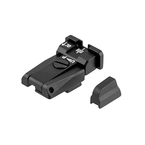 Dessa låga profilerade sikten har micrometriska justeringar för vind och höjd med härdade klickskruvar och en avsmalnande dovetail för ett starkt lås i den befintliga spåret. Framsikten och baksikten är drop-in ersättningar som passar fabriksdovetail; viss vapensmedsarbete eller anpassning kan krävas, särskilt för framsiktet.