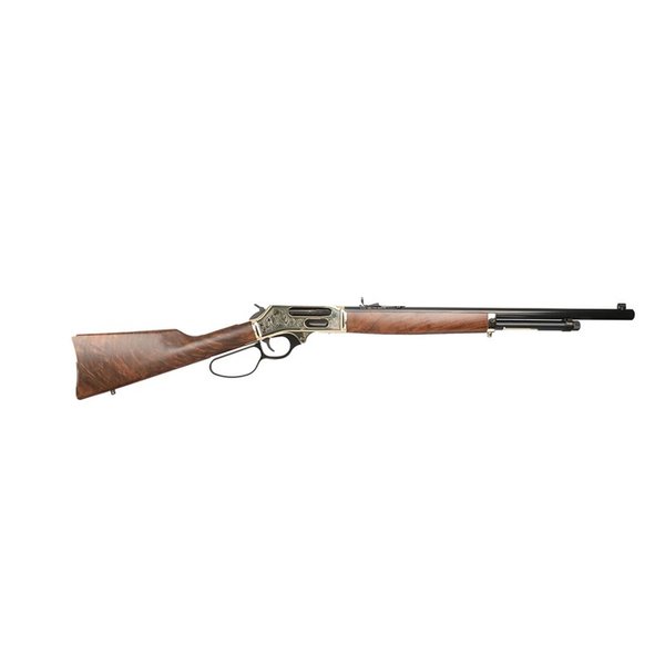 H010GWL i .45-70 är en kraftfull och smidig modell med sin 18.43-tums pipan under semi-buckhorn bakre och höga bronsbead fram sikten. En ruggad pistolgrepp av valnöt, sling swivel studs och ventilerad svart gummireky pad kompletterar paketet. Den delar även gravyrmönstret från .45-70 brons Wildlife Edition, där en 24K guldreliefprofil av en björn pryder vänster sida av den blästrade ramen inuti guldaccentuerade scroll, linje och flätade kanter, med en guldreliefbild av ett älghuvud på höger sida.