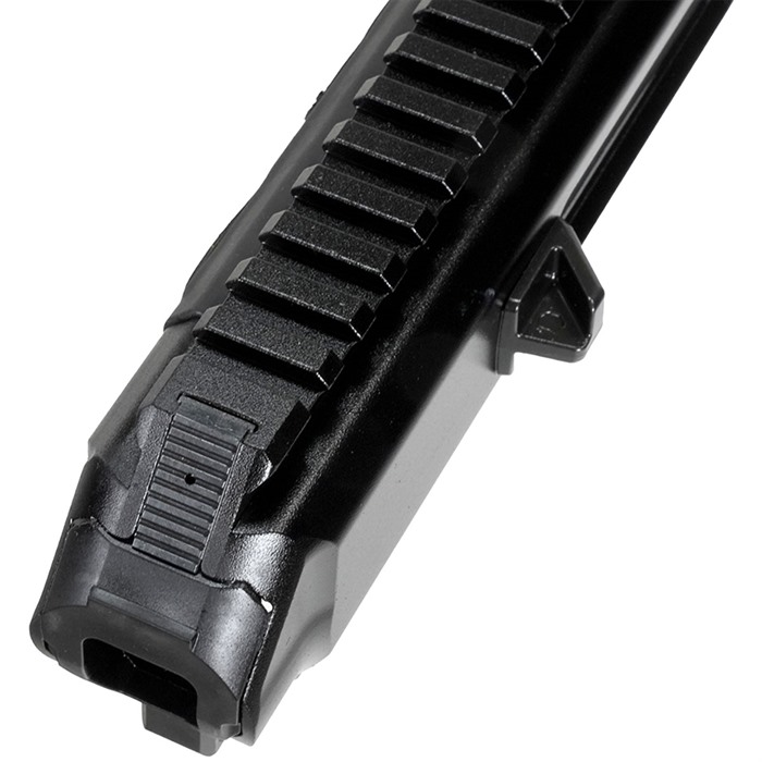 - Förbättrad ergonomi: Laddhandtaget lutar nedåt för enklare grepp och manuell låsning av slutstycket.