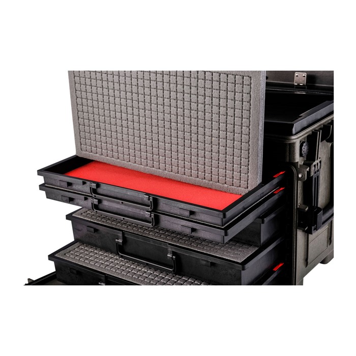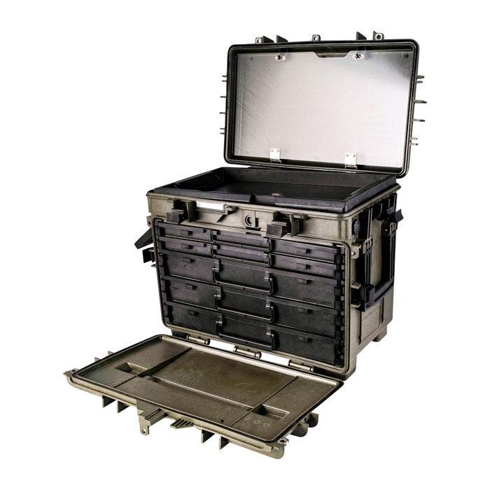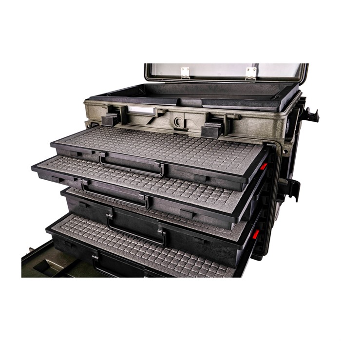 Brownells Generation III Armorers Case – Built to Extreme Testing Standards Enhanced Armorers Case now has the ability to be an easy to access toolbox in your workshop, and quickly configured for transport. Manufactured from durable polypropylene, the Gen III Armorers Case is waterproof and durable enough for any expedition (See below for Test Specifications). With three (3x) 2.4in tall and two (2x) 1.2 in drawers, there is plenty of storage for your essential tools. Case features two carrying handles on either side, as well as top telescoping luggage handle for use with the two integral wheels. Front door and top lid can be removed, by turning a locking screw in the hinge, allowing for easy access to drawers and to compartment when not travelling. Drawers have depressible tabs, that allow complete drawer removal, while also ensuring tools don’t inadvertently fall out. Stackable design ensures any additional Armorers Cases neatly stack for clean organization. Top and front jam free lid latches are easy to operate and firmly secure all sides in transit. Interior of Lid features a clear polymer door, so that documentation, spare parts or additional tools can be stored in otherwise unused space. Optional pluckable foam keeps tools from shifting during transit and protects your investments. Drawer Internal Dimensions: Large Drawer: 2.4 inches Tall x 18.4 inches Wide x 10 inches Deep Small Drawer: 1.2 inches Tall x 18.4 inches Wide x 10 inches Deep Top Removable Tray Internal Dimensions: 1.25 inches Tall x 18 inches Wide x 10.25 inches Deep Total Case Weight: 21.49 lbs Operating Temperature: -27.4°F to 194°F Test Specifications: STANAG 4280 - DEF-STD 81-41 (Part 3 Issue 4) Impact Horizontal Test - 2.5m Impact Vertical Test - 2.5m Vibration Test – 5-350Hz Dry-Heat Test – 68 to 176 °F 50-80% Humidity for 3 hours Low Temp Test Storage Test - -40°F to 194°F, humidity not less than 90%, cycle of 28 times CEI EN 60529 Dust Ingress Test – 2-8 Hours Water Ingress Test – 1m for 30min