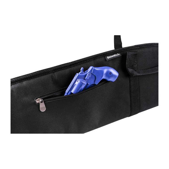 Brownells Scoped Rifle Case Case Shape Accommodates Scoped & Non-Scoped Rifles Removable, Adjustable Shoulder Strap w/ All Metal Swivels 2 1⁄4” Total Extra Thick Soft, Close Cell Padding Full Length Zipper w/ Pull Durable, Heavy-Duty Nylon Water-Resistant Outer Shell Zippered Accessory Pocket Soft, Fur Inner Lining For Maximum Protection Heavy-Duty Double Stitching