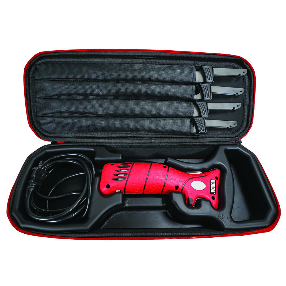 The 110V Bubba Electric Fillet Knife is designed by exceptional engineers to provide you with the best electric fillet knife for your success on the water. This Bubba Electric Fillet Knife is ergonomically crafted to fit your hands, and the iconic non-slip grip allows you to fillet fish with ease. Hours of testing and detailing have been put into creating an electric knife equipped with the most advanced technology. The uniquely designed ventilation is engineered for maximized motor and transmission output, providing you with the most efficient cut in the industry. Included are four different blade styles that reflect our renowned tapered flex and stiff fillet knives. The blade options are the following: 7” e-flex blade, 9” e-flex blade, 9’ e-stiff blade and a 12” e-stiff blade. The perfect combination of two flexible blades and two stiff blades, allows you to fillet any size fish at any given time. All Bubba blades are constructed out of high carbon stainless-steel and finished with a titanium nitride coating. These premium materials make the blades extremely corrosion resistant and cause the meat to effortlessly fall off the knife. It features an 8' cord, a safety lock and trigger guard for ultimate usability. The electric fillet knife comes in our high-quality, all-weather carrying case, masterfully designed with removable internal components to simplify cleaning and storage. Ready to fillet any size fish with its variety of blades and advance technology, Bubba's engineers built your knife for life.