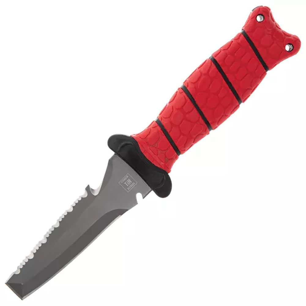 Kniven levereras helt utrustad med vårt ikoniska, halkfria handtag och blad som är belagt med titan-nitrid. Den full-tang konstruktionen är designad med en rak vass egg och en sågad egg. Slutligen inkluderar våra dykknivar ett lyxigt låsbart fodral – speciellt designat för spjutfiske, som inkluderar gummiband för att hålla den på kroppen.