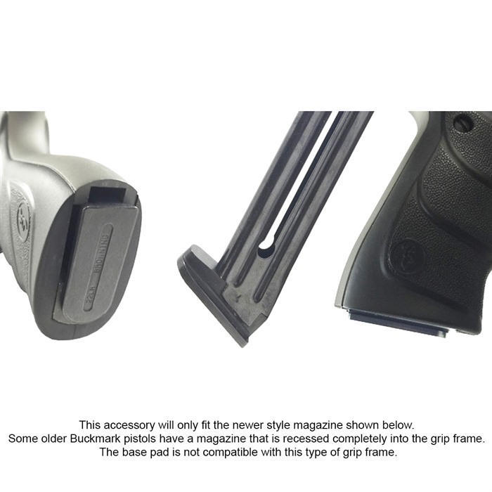 Observera: Det finns ett par olika typer av magasin för Browning Buck Mark. Detta tillbehör passar endast den nyare stilens magasin som visas nedan. Vissa äldre Buckmark-pistoler har ett magasin som är helt nedsänkt i greppramen. Basplattan är inte kompatibel med denna typ av greppram.