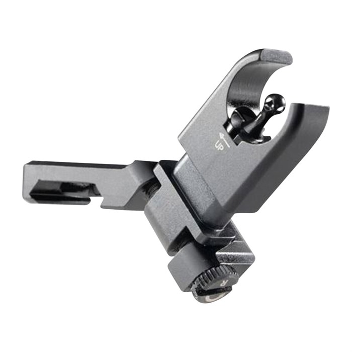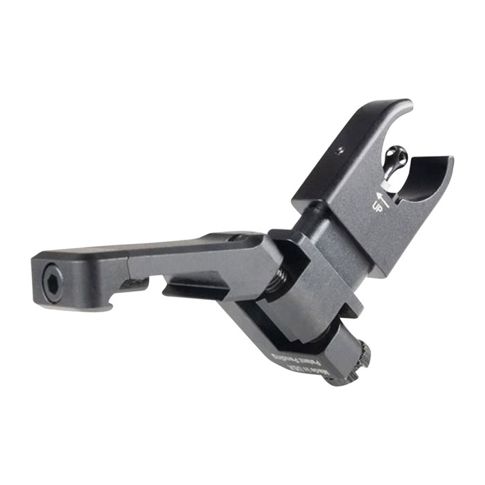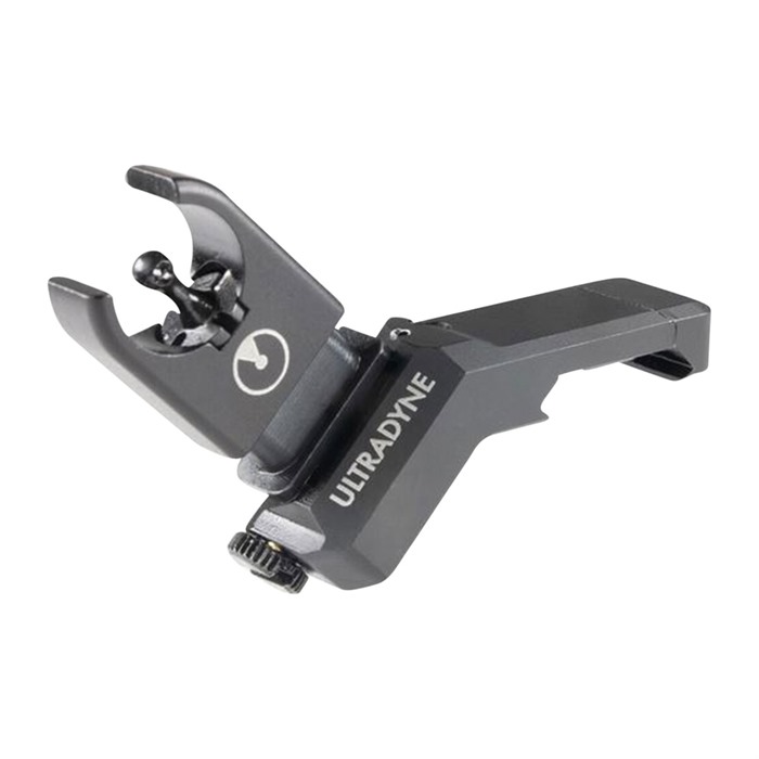 Iron sights have been trusted by rifle shooters for centuries, but one of the inescapable drawbacks of irons is the fact that they have to cover the target for an accurate shot. What if you could see your target while getting your sights aligned? That's exactly what the Ultradyne C4 Offset Front Sight is designed to do. Unlike traditional front-sight posts, each Ultradyne C4 Front Sight features a hole drilled through its center. To get an AR-15 on target, shooters simply have to align the hole in the front post with a compatible rear sight to form concentric rings. This innovative sighting system is part of the Dynalign technology used to form the company's "circle-within-circle" sight picture. Mounts to any MIL-STL 1913 Picatinny rail Made from combination of 4140 chrome-moly steel and 7075 aluminum Weight: 1.2 ounces Treated with salt-bath nitride finish and anodized-black finish The 45-degree offset design of the Ultradyne C4 Front Sight allows it to be used without impeding the sight picture of a mounted optic. If users want to minimize the profile of their rifle, the sight folds down when not in use.