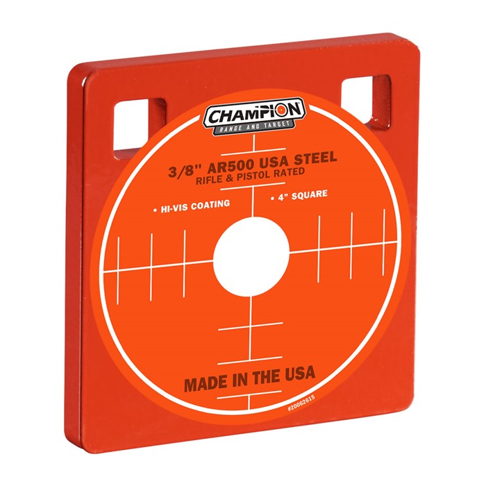 Steel targets have always provided solid benefits for target shooters, due to the fact that they offer instantaneous visual and audio confirmation of an on-target hit. The Champion Center Mass Steel Targets are a great addition to any range setup. The Champion Center Mass Steel Targets are constructed from high-quality AR500 steel, which is chosen specifically for its ability to stand up to most centerfire rifle rounds for years of dependable, durable service. Square-shaped target design Target options available in 4-inch and 8-inch diameters Measures 3/8 of an inch thick The Champion Center Mass Steel Targets feature clean edges that are precision-cut with laser-guided equipment. Easy mounting is provided through the use of square-cut holes designed for use with 1/2-inch carriage bolts.