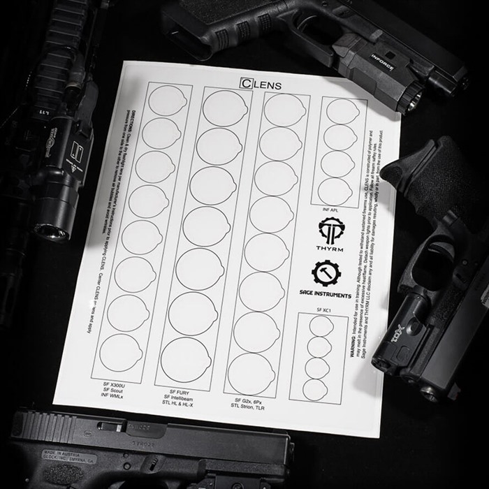 CLENS LENS PROTECTION FOR FLASHLIGHTS AND WEAPON LIGHTS Lights only work well when their lenses are clean. Each CLENS Protector provides an easy way to protect lenses during extended shooting sessions. Just like goggle tear-offs for off-road riding, just remove the dirty CLENS to return your light to its optimal brightness. CLENS (pronounced “cleanse”) come as a set of heat-resistant clear polymer circles, cut to fit on a wide range of flashlight and weapon-light lenses. Each CLENS Protector protects the lens from carbon and other debris that can build up during firearms training. Each CLENS Protector has a small tear-away tab. The CLENS Protector can be removed to quickly clean a light, rather than having to apply Vaseline before shooting, replace a lens, or risk abrasion with lens cleaners. Each CLENS’ mild adhesive backing has a higher affinity for polymer than glass. Attach and position easily, without leaving adhesive on clean glass. However, the adhesive may stick to a dirty or damaged lens. In this case, touching the sticky side of the CLENS to any residual adhesive should remove the adhesive from the lens. Designed and manufactured in the USA. * Follow all firearm safety rules at all times. Detach lights from firearms prior to installing, removing, cleaning, or replacing the CLENS.