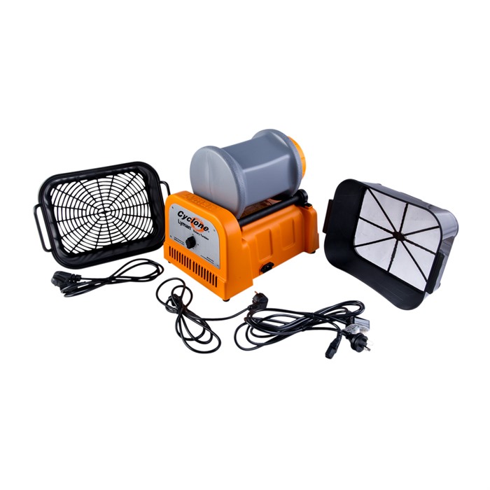 The Cyclone Rotary Tumbler takes brass cleaning to a whole new level. The rotary tumbling action combined with the stainless steel media and liquid cleaning solution gets brass cleaner on the outside than vibratory tumbling methods. The small stainless pins easily slip inside cases and into primer pockets to provide superior cleaning action in these areas. Something that vibratory tumbler will not do! The large capacity drum holds up to 1000 pieces of .223 brass and features a rubber lining to protect brass and greatly reduce noise during operation. A built in timer in the base can be set to run from 0 to 3 hours, shutting off automatically. The drum features a large end cap to allow easy loading and unloading. In addition, the tumbler comes with a pair of unique sifter pans which makes separating pins from the cases a breeze! Simply empty the tumbler into the stacked pans. The first pan catches the brass, while the second fine screen pan catches the pins. Five pounds of stainless media pins and a sample packet of Brass Cleaning Solution are also included.